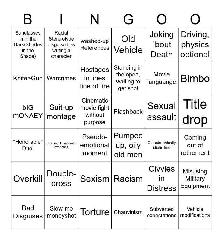 This bingo card has 36 words: Racism, Sexism, Chauvinism, Knife>Gun, "Honorable" Duel, Flashback, Warcrimes, Torture, Joking ´bout Death, Civvies in Distress, Bimbo, Old Vehicle, Misusing Military Equipment, Suit-up montage, Standing in the open, waiting to get shot, Sunglasses in in the Dark(Shades in the Shade), Overkill, Sexual assault, bIG mONAEY, washed-up References, Cinematic movie fight without purpose, Bickering/Homoerotic overtones, Pumped up, oily old men, Pseudo-emotional moment, Catastrophically idiotic line, Racial Stererotype disguised as writing a character, Movie languange, Slow-mo moneyshot, Hostages in lines line of fire, Driving, physics optional, Vehicle modifications, Bad Disguises, Coming out of retirement, Title drop, Double-cross and Subverted expectations.