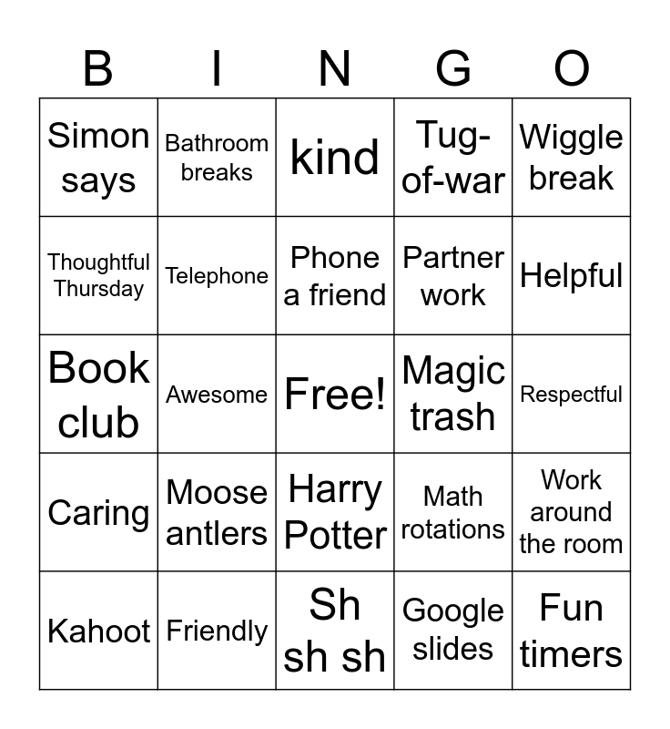 This bingo card has a free space and 25 words: Moose antlers, Sh sh sh, Phone a friend, Kahoot, Wiggle break, Simon says, Thoughtful Thursday, Bathroom breaks, Magic trash, Harry Potter, Partner work, Book club, Math rotations, Work around the room, Telephone, Flexible, Respectful, kind, Helpful, Awesome, Fun timers, Friendly, Caring, Tug-of-war and Google slides.