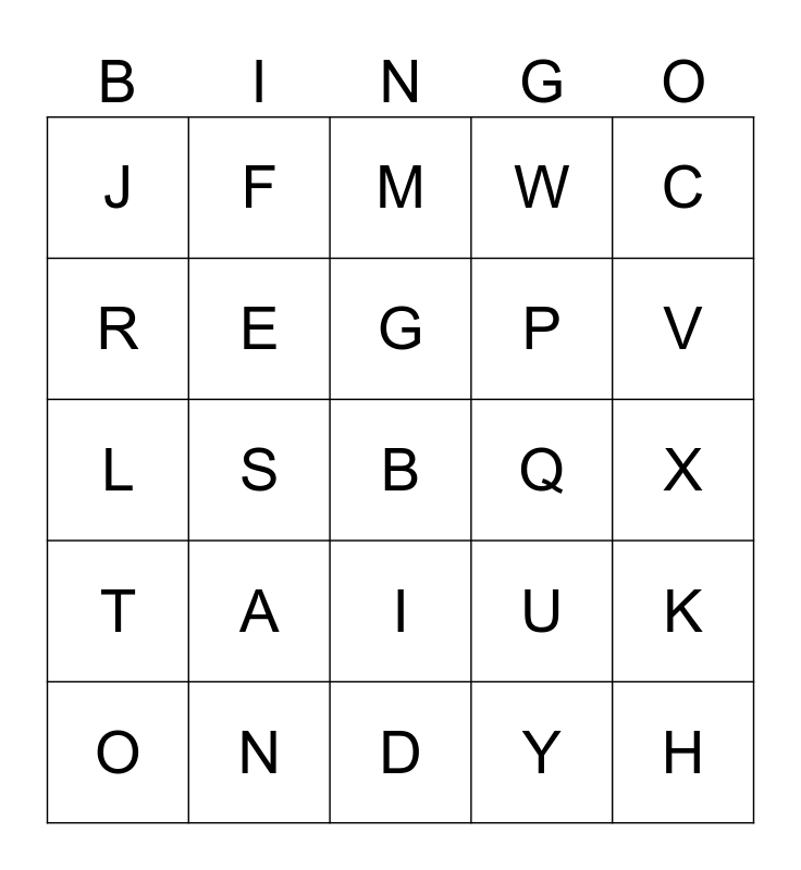 This bingo card has a free space and 24 words: A, N, G, O, C, J, R, F, Q, I, P, L, U, K, E, Y, X, M, V, S, H, T, W and D.
