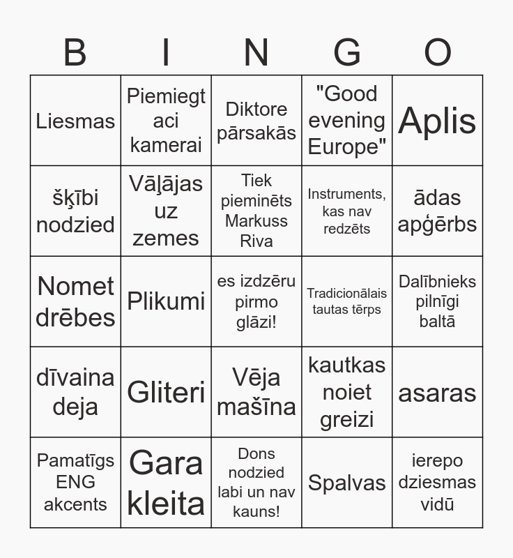 This bingo card has a free space and 24 words: Gliteri, Gara kleita, Tiek pieminēts Markuss Riva, Pamatīgs ENG akcents, Aplis, Liesmas, šķībi nodzied, Piemiegt aci kamerai, Tradicionālais tautas tērps, Vēja mašīna, Instruments, kas nav redzēts, Nomet drēbes, kautkas noiet greizi, asaras, Vāļājas uz zemes, Spalvas, Dalībnieks pilnīgi baltā, Diktore pārsakās, ādas apģērbs, Plikumi, ierepo dziesmas vidū, dīvaina deja, "Good evening Europe" and Dons nodzied labi un nav kauns!.