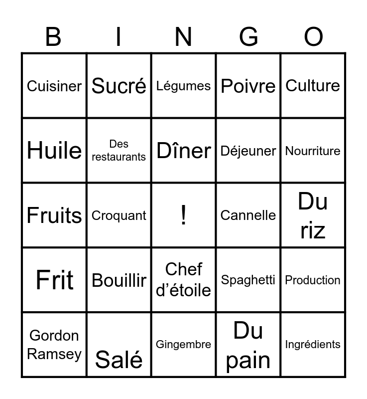This bingo card has a free space and 24 words: Bouillir, Salé, Dîner, Gordon Ramsey, Culture, Cuisiner, Huile, Sucré, Cannelle, Chef d’étoile, Déjeuner, Fruits, Spaghetti, Production, Des restaurants, Du pain, Du riz, Légumes, Nourriture, Croquant, Ingrédients, Frit, Poivre and Gingembre.