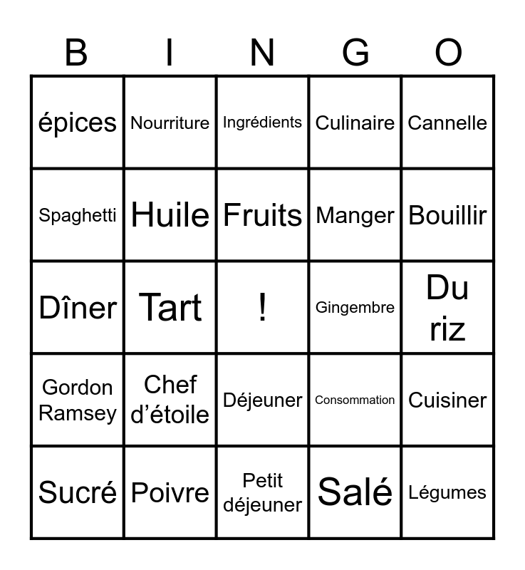 This bingo card has a free space and 24 words: Chef d’étoile, Poivre, Fruits, Sucré, Cannelle, épices, Spaghetti, Nourriture, Gingembre, Déjeuner, Manger, Dîner, Consommation, Cuisiner, Huile, Salé, Du riz, Ingrédients, Bouillir, Tart, Légumes, Gordon Ramsey, Culinaire and Petit déjeuner.