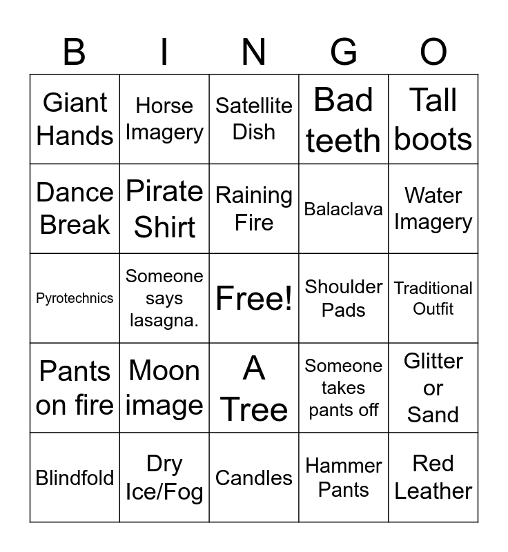 This bingo card has a free space and 43 words: Black Leather, Red Leather, Trans Flags/Colors, Blindfold, Mulcolored Hair, Hammer Pants, Satellite Dish, One Lone Spotlight, Tall boots, Dry Ice/Fog, Bad teeth, Shoulder Pads, A Tree, Moon image, Horns, Candles, Change of costume during performance, Pyrotechnics, Long Fingernails, Water Imagery, Horse Imagery, Traditional instruments, Reference to Love, Giant Hands, Microphone, Traditional Outfit, Gold Outfits, Laying Down, Someone takes pants off, Pants on fire, Shoulder Pads, Glitter or Sand, Dry Ice/Fog, Someone says lasagna., One lone spotlight, Raining, Snowing, Raining Fire, Dance Break, Balaclava, Lace, Pirate Shirt and Men in skirts.