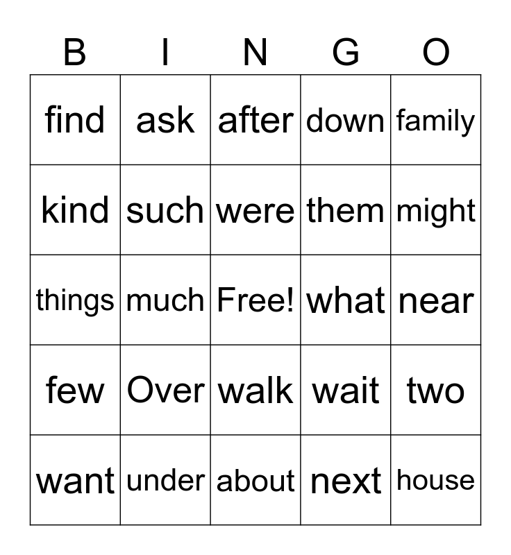 This bingo card has a free space and 24 words: Over, under, were, want, family, find, kind, ask, what, walk, them, things, wait, two, such, next, near, after, might, much, house, few, down and about.