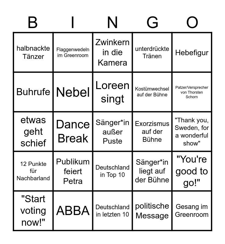This bingo card has 61 words: Free!, ABBA, Windmaschine, 12 Punkte für Nachbarland, politische Message, Feuer, Nebel, folkloristisches Instrument, Kostümwechsel auf der Bühne, sehr lange Note, unterdrückte Tränen, Freudentränen, Buhrufe, Publikum singt mit, schiefer Gesang, halbnackte Tänzer, Sänger*in außer Puste, Hebefigur, "Schweden hat 7 mal gewonnen", Loreen singt, Exorzismus auf der Bühne, Zwinkern in die Kamera, "Start voting now!", "You're good to go!", "Good morning Australia!", Song about Love, Song about Peace, Cringe-Kommentar von Thorsten Schorn, Patzer/Versprecher von Thorsten Schorn, Petra Mede macht Witz über sich selbst, Es wird Französisch gesprochen, Jury-Vote von ehem. Teilnehmer*in, Moderatorin singt, Måns Zelmerloew taucht auf, Flaggenwedeln im Greenroom, zwei Menschen küssen sich, Flaggenwedeln im Publikum, Dance Break, Rap-Part, etwas geht schief, folkloristisches Kostüm, Publikum feiert Petra, "Thank you, Sweden, for a wonderful show", Land bekommt 0 Punkte von Jury/Televote, Sänger*in liegt auf der Bühne, ein Tier ist zu sehen, Pelz oder Federn, Pailletten, Tonartwechsel, Deutschland in Top 10, Deutschland in letzten 10, geschminkte Flaggen im Publikum, Publikum klatscht mit, Sonnenbrille indoor, Glitzerregen, Lack-/Leder-Outfit, barfuß auf der Bühne, Deutschland bekommt einen Punkt, Schulterpolster, Gesang im Greenroom and Gay Joke.