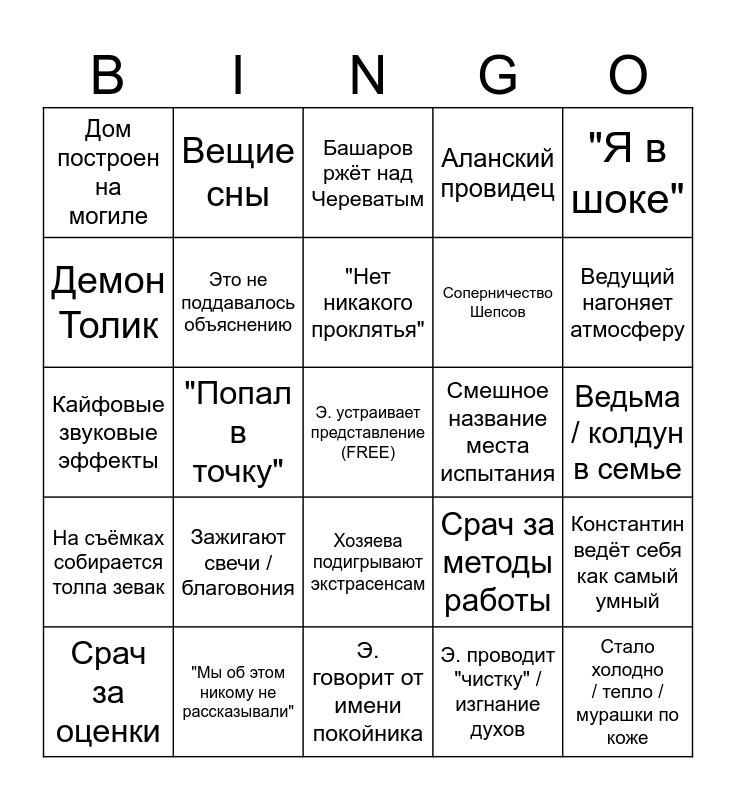 This bingo card has a free space and 31 words: Э. говорит от имени покойника, Неупокоенный дух в доме, "Попал в точку", Э. находит место смерти / могилу, Дом построен на могиле, Башаров ржёт над Череватым, Это не поддавалось объяснению, Срач за методы работы, Смешное название места испытания, Э. проводит "чистку" / изгнание духов, Ведьма / колдун в семье, Стало холодно / тепло / мурашки по коже, Пассивная агрессия, За вами мёртвые стоят, Ведущий нагоняет атмосферу, Съёмочная группа в кадре, Константин ведёт себя как самый умный, Зажигают свечи / благовония, На съёмках собирается толпа зевак, Хозяева подигрывают экстрасенсам, "Я в шоке", "Они не знают, что их ждёт", Срач за оценки, Вещие сны, Соперничество Шепсов, Демон Толик, Аланский провидец, Кайфовые звуковые эффекты, "Мы об этом никому не рассказывали", "Нет никакого проклятья" and Общение с семьёй после испытания.