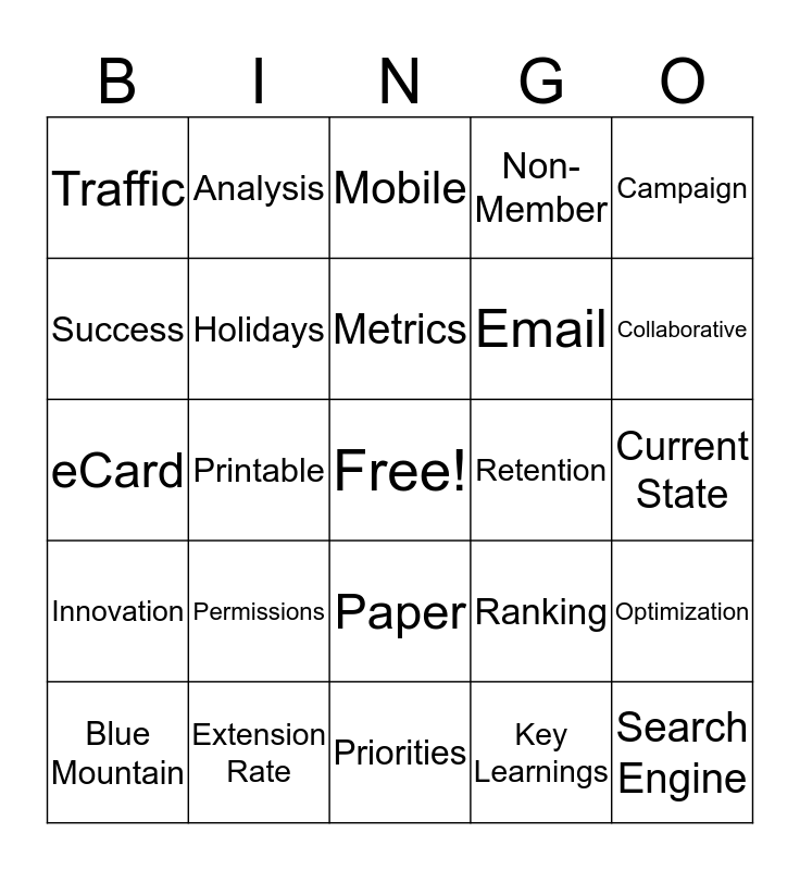 This bingo card has a free space and 24 words: Permissions, Extension Rate, Metrics, Blue Mountain, Campaign, Traffic, Success, Analysis, Retention, Paper, Email, eCard, Ranking, Optimization, Holidays, Key Learnings, Current State, Mobile, Collaborative, Printable, Search Engine, Innovation, Non-Member and Priorities.