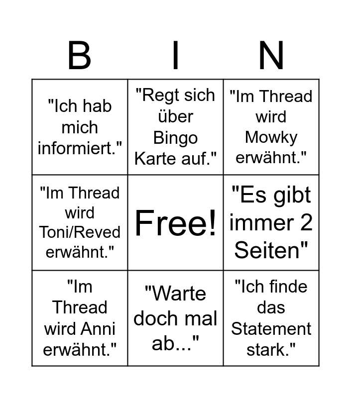 This bingo card has a free space and 8 words: "Es gibt immer 2 Seiten", "Im Thread wird Mowky erwähnt.", "Regt sich über Bingo Karte auf.", "Im Thread wird Anni erwähnt.", "Ich hab mich informiert.", "Ich finde das Statement stark.", "Im Thread wird Toni/Reved erwähnt." and "Warte doch mal ab...".