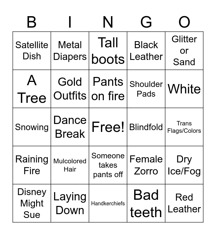 This bingo card has a free space and 40 words: Raining, Snowing, Traditional Outfit, Gold Outfits, Laying Down, Someone takes pants off, Pants on fire, Shoulder Pads, Glitter or Sand, Raining Fire, Dance Break, Black Leather, Red Leather, Trans Flags/Colors, Blindfold, Mulcolored Hair, Hammer Pants, Satellite Dish, One Lone Spotlight, Tall boots, Dry Ice/Fog, Bad teeth, Shoulder Pads, A Tree, Moon image, Horns, Candles, Change of costume during performance, Pyrotechnics, Giant Hamster, Wheel, Disney Might Sue, Too Many Flowers, Female Zorro, White, Handkerchiefs, Men in Skirts, Men in Thongs, Metal Diapers and Single Pant Leg.