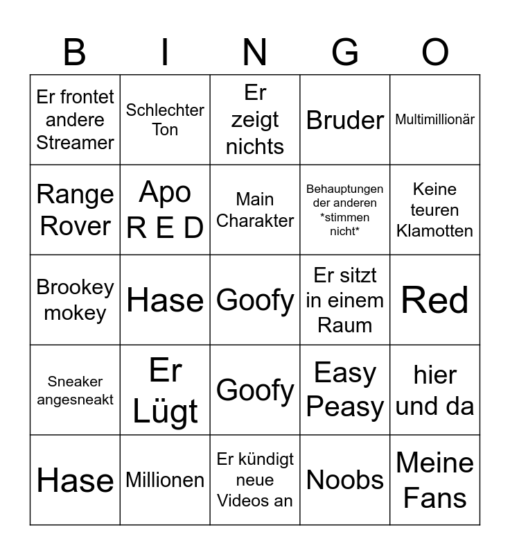 This bingo card has a free space and 24 words: Hase, Er Lügt, Main Charakter, Noobs, Multimillionär, Er frontet andere Streamer, Schlechter Ton, Er zeigt nichts, Er sitzt in einem Raum, Red, Brookey mokey, Apo R E D, Easy Peasy, hier und da, Range Rover, Millionen, Er kündigt neue Videos an, Bruder, Keine teuren Klamotten, Sneaker angesneakt, Hase, Goofy, Behauptungen der anderen *stimmen nicht* and Meine Fans.