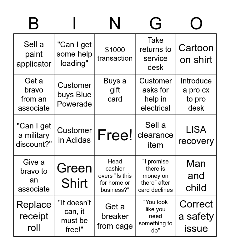 This bingo card has a free space and 37 words: Can I speak to your manager, Bald man, Can I get a key made, Customer buys Blue Powerade, Man and child, Green Shirt, Buys a gift card, Propane Exchange, Cartoon on shirt, Sings along to music, Customer in Adidas, Take returns to service desk, Correct a safety issue, LISA recovery, Get a bravo from an associate, Give a bravo to an associate, Customer pays with cash, $1000 transaction, Head cashier overs "Is this for home or business?", Sell a clearance item, Sell a paint applicator, Introduce a pro cx to pro desk, Replace receipt roll, Get a breaker from cage, "Can you check the balance on this", "You look like you need something to do", "Can I get some help loading", $89? No, it said $49 back on shelf (ridiculous incorrect price), "Does this take cash" as they are at the SCO, Customer stares for more than 5 seconds once prompted to remove card, Customer makes bad dad joke, "It doesn't can, it must be free!", "Can I get a military discount?", "These prices are crazy", "I promise there is money on there" after card declines, Customer asks for help in electrical and Customer asks if we have bizarre plant name.