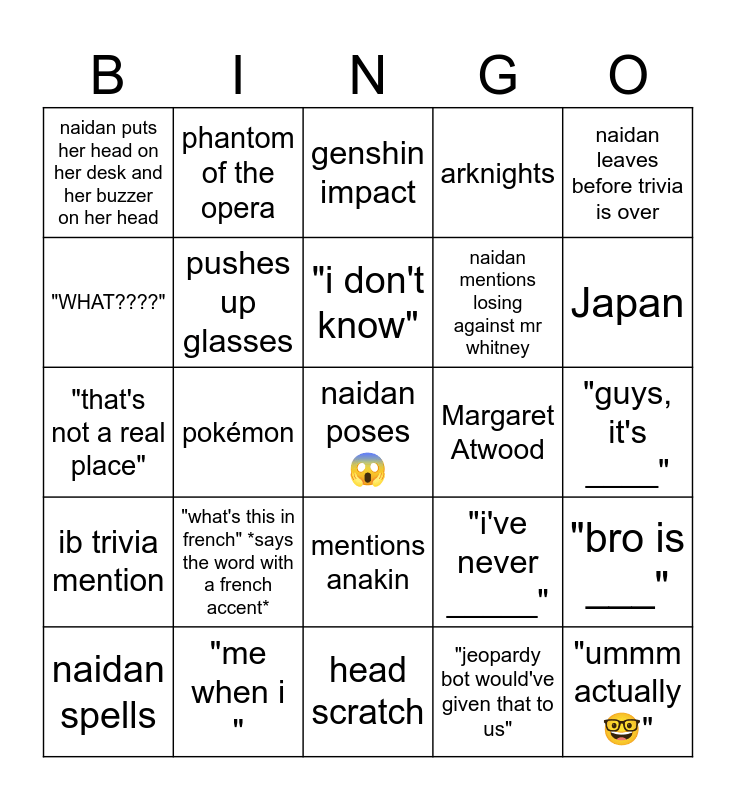 This bingo card has a free space and 29 words: naidan spells, wamoose, pokémon, miku, naidan puts her head on her desk and her buzzer on her head, genshin impact, pushes up glasses, "what's this in french" *says the word with a french accent*, Margaret Atwood, "me when i ", "guys, it's ____", "ummm actually 🤓", head scratch, "jeopardy bot would've given that to us", Japan, "i can handle # ___s, but #___s????", mentions anakin, ib trivia mention, naidan leaves before trivia is over, "that's not a real place", "i've never _____", dawg, naidan mentions losing against mr whitney, "WHAT????", arknights, phantom of the opera, "bro is ___", "i don't know" and widdowily.