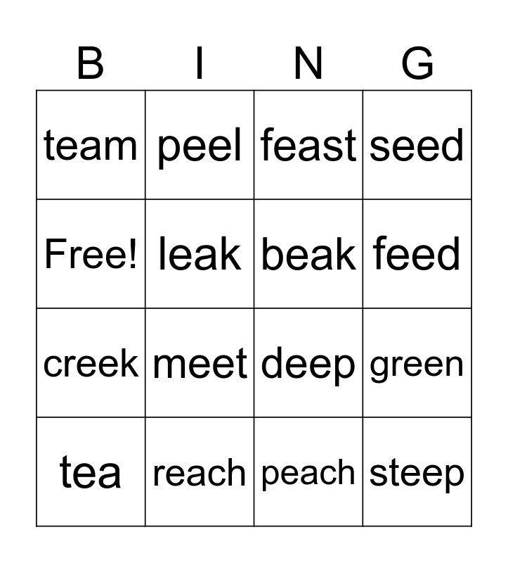 This bingo card has 16 words: reach, green, feast, team, creek, peel, deep, peach, Free!, leak, tea, seed, meet, feed, beak and steep.