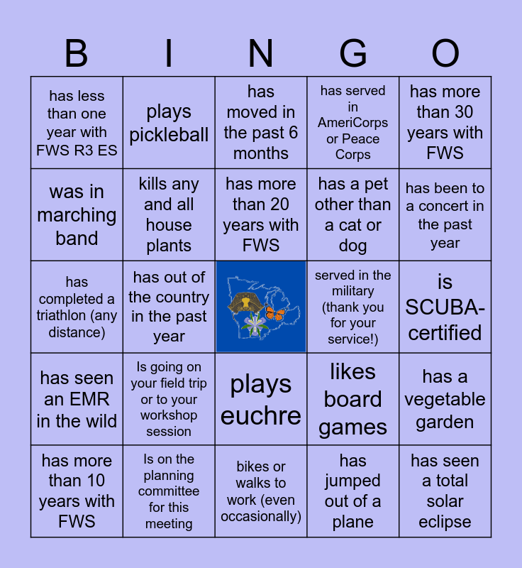 This bingo card has a free space and 24 words: Is going on your field trip or to your workshop session, Is on the planning committee for this meeting, has more than 20 years with FWS, has more than 10 years with FWS, has more than 30 years with FWS, has less than one year with FWS R3 ES, was in marching band, plays pickleball, served in the military (thank you for your service!), plays euchre, has a pet other than a cat or dog, has completed a triathlon (any distance), likes board games, has a vegetable garden, kills any and all house plants, has jumped out of a plane, is SCUBA-certified, has moved in the past 6 months, has been to a concert in the past year, has out of the country in the past year, has seen a total solar eclipse, has seen an EMR in the wild, has served in AmeriCorps or Peace Corps and bikes or walks to work (even occasionally).