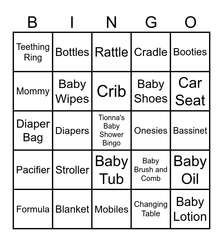 This bingo card has a free space and 24 words: Formula, Stroller, Crib, Changing Table, Booties, Teething Ring, Bottles, Rattle, Onesies, Bassinet, Diaper Bag, Baby Wipes, Baby Brush and Comb, Baby Oil, Mommy, Blanket, Mobiles, Cradle, Car Seat, Pacifier, Diapers, Baby Tub, Baby Shoes and Baby Lotion.