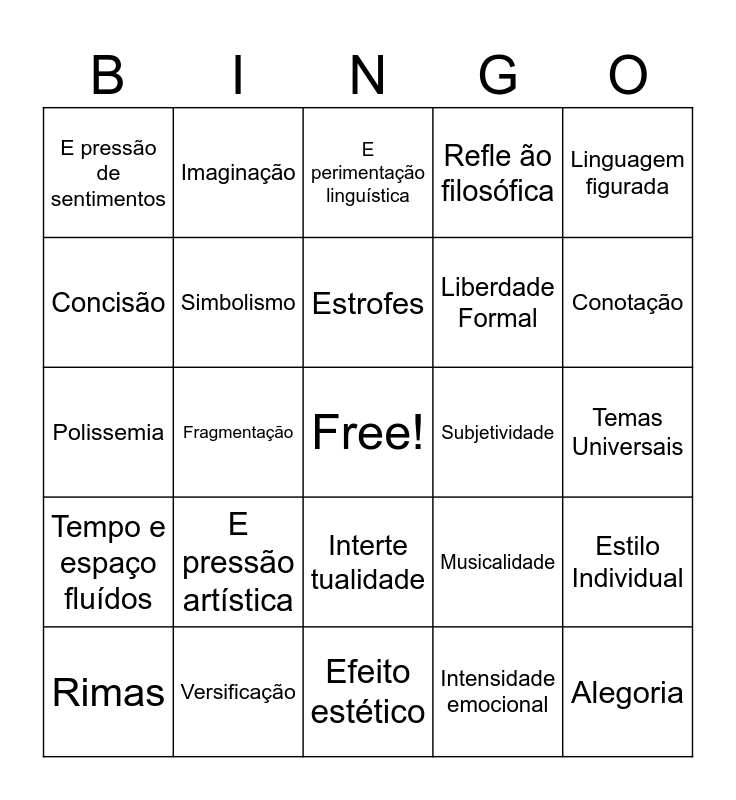 This bingo card has a free space and 24 words: E pressão artística, Versificação, Estrofes, Rimas, Linguagem figurada, E pressão de sentimentos, Concisão, Imaginação, Subjetividade, Interte tualidade, Liberdade Formal, Polissemia, Musicalidade, Estilo Individual, Simbolismo, Intensidade emocional, Temas Universais, E perimentação linguística, Conotação, Fragmentação, Alegoria, Tempo e espaço fluídos, Refle ão filosófica and Efeito estético.