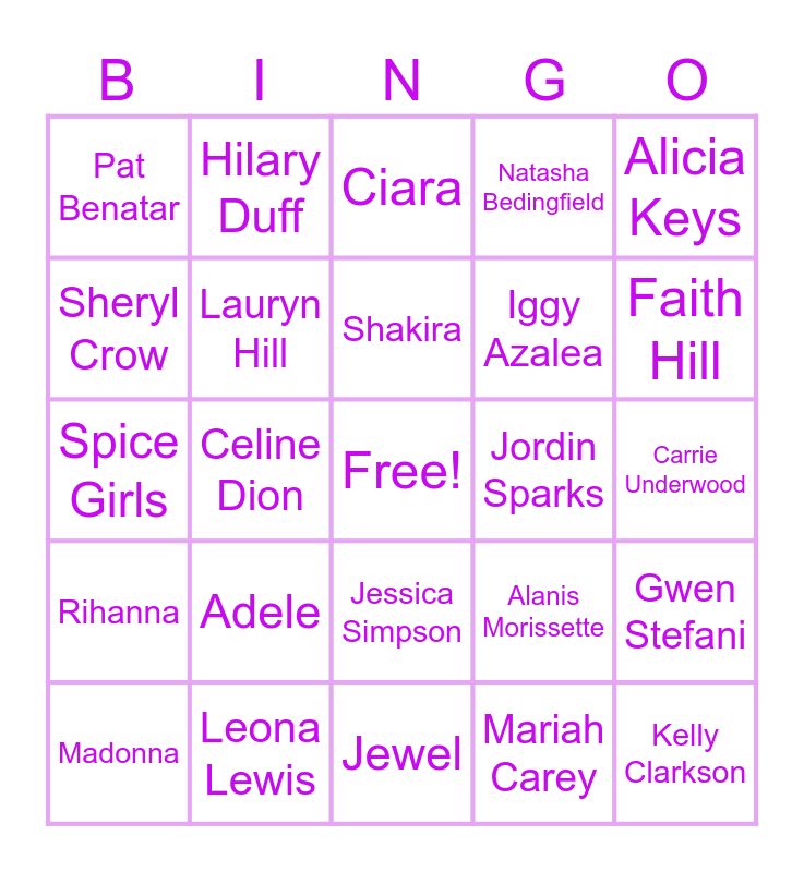 This bingo card has a free space and 42 words: Beyonce, Shakira, Jennifer Lopez, Adele, Mariah Carey, Gwen Stefani, Kelly Clarkson, P!nk, Ciara, Jessica Simpson, Carrie Underwood, Faith Hill, Celine Dion, Alicia Keys, Katy Perry, Alanis Morissette, Fergie, Spice Girls, Britney Spears, Hilary Duff, Sheryl Crow, Christina Aguilara, Ashlee Simpson, Pat Benatar, Cyndi Lauper, Janet Jackson, Iggy Azalea, Mandy Moore, Meghan Trainor, Reba McEntire, Jessie James Decker, Rihanna, Lauryn Hill, Jewel, Norah Jones, Madonna, Leona Lewis, Jordin Sparks, Shania Twain, Vanessa Carlton, Natasha Bedingfield and Jessie J.
