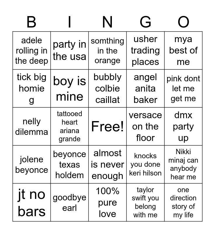 This bingo card has a free space and 24 words: jt no bars, beyonce texas holdem, bubbly colbie caillat, taylor swift you belong with me, mya best of me, adele rolling in the deep, party in the usa, somthing in the orange, versace on the floor, dmx party up, nelly dilemma, boy is mine, knocks you done keri hilson, Nikki minaj can anybody hear me, tick big homie g, goodbye earl, 100% pure love, usher trading places, pink dont let me get me, jolene beyonce, tattooed heart ariana grande, almost is never enough, angel anita baker and one direction story of my life.