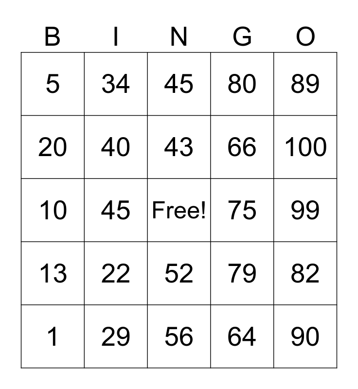 This bingo card has a free space and 24 words: 1, 22, 43, 64, 89, 5, 34, 45, 75, 99, 10, 40, 79, 82, 20, 29, 56, 80, 100, 13, 45, 52, 66 and 90.