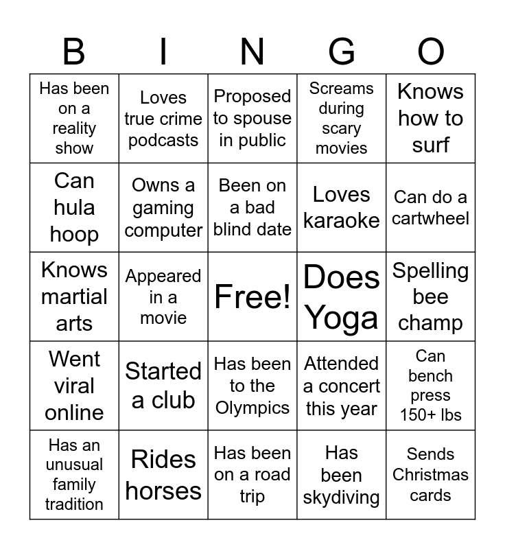 This bingo card has a free space and 33 words: Knows how to read tarot, Knows ASL, Appeared in a movie, Met a celebrity, Went viral online, Owns a gaming computer, Knows how to surf, Has an unusual family tradition, Loves true crime podcasts, Likes pineapple on pizza, Been on a bad blind date, Proposed to spouse in public, Been to Disney this year, Loves roller coasters, Does Yoga, Can do a cartwheel, Rides horses, Knows martial arts, Started a club, Attended a concert this year, Has been to the Olympics, Has a pen pal, Has been on a reality show, Spelling bee champ, Has been on a road trip, Sends Christmas cards, Screams during scary movies, Loves karaoke, Can hula hoop, Can bench press 150+ lbs, Good at escape rooms, Has been skydiving and Won an eating competition.