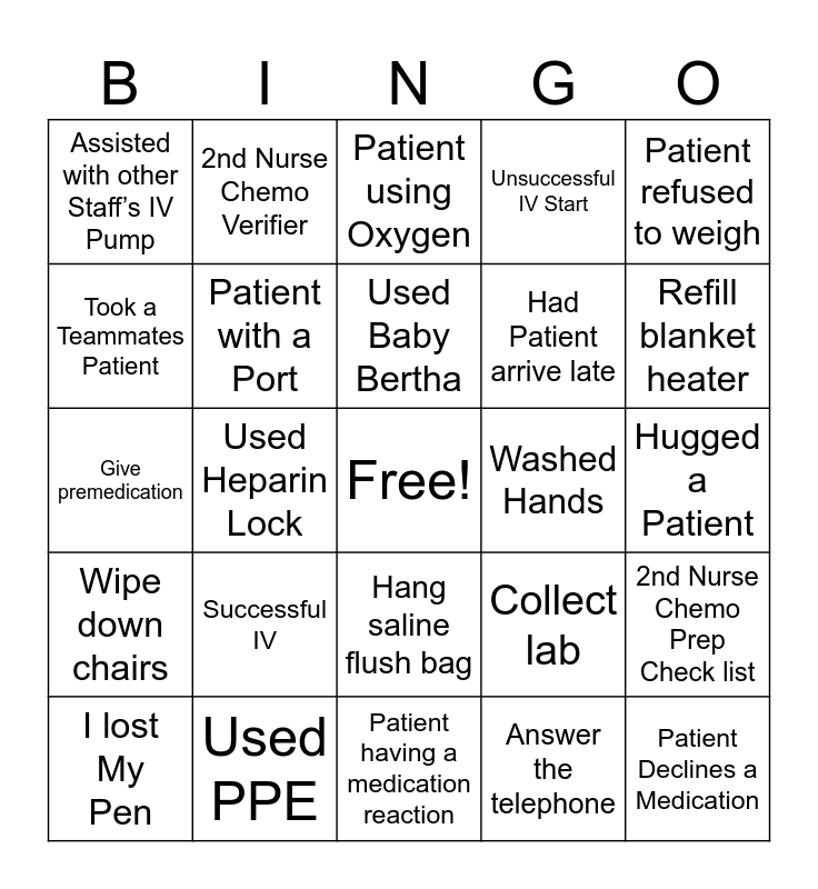 This bingo card has a free space and 29 words: I lost My Pen, I’m Wearing Scrubs, Used Heparin Lock, Gave SQ Injection, Assisted with other Staff’s IV Pump, Patient using Oxygen, Patient with a Port, Successful IV, Washed Hands, Used PPE, Hugged a Patient, Patient Declines a Medication, Patient having a medication reaction, Answer the telephone, Refill blanket heater, Prepare an IV tray, Hang saline flush bag, Wipe down chairs, Patient refused to weigh, Give premedication, Collect lab, Obtain vital signs, Had Patient arrive late, Took a Teammates Patient, Unsuccessful IV Start, 2nd Nurse Chemo Verifier, 2nd Nurse Chemo Prep Check list, Used Baby Bertha and Printed Patient Education.