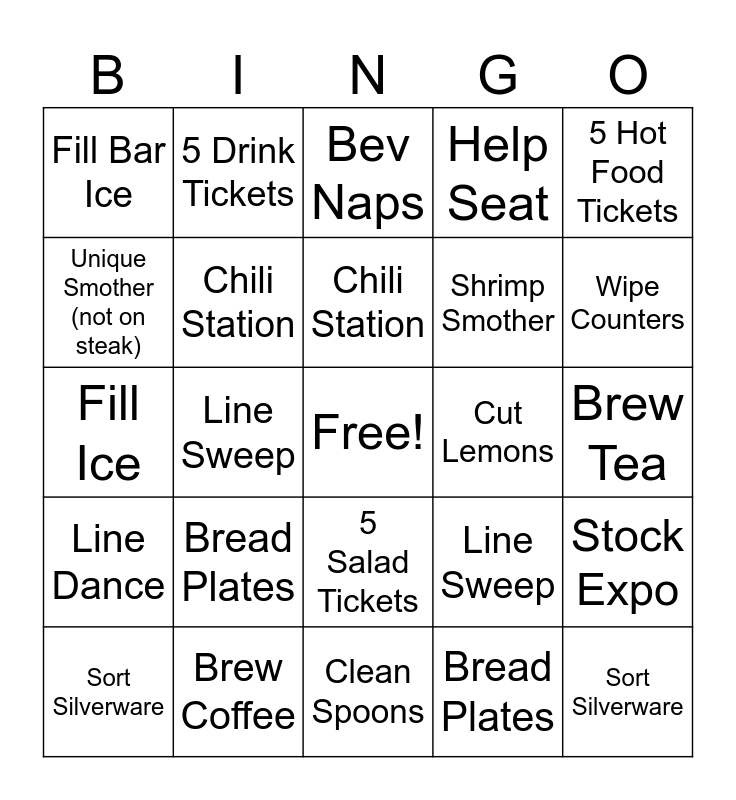 This bingo card has a free space and 29 words: Sort Silverware, Fill Ice, Line Sweep, Stock Expo, Fill Bar Ice, Bev Naps, Chili Station, Bread Plates, Cut Lemons, Brew Coffee, Brew Tea, Sort Silverware, Clean Spoons, Bread Plates, Wipe Counters, Help Seat, 5 Salad Tickets, Line Dance, 5 Hot Food Tickets, Fill Ice, Line Sweep, Disneyland, Shrimp Smother, Unique Smother (not on steak), Help Seat, 5 Drink Tickets, Stock Expo, Chili Station and Stock Glassware.