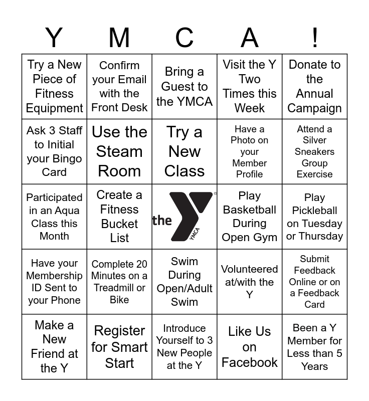 This bingo card has a free space and 30 words: Register for Smart Start, Enjoy a Cup of Coffee in the Lounge, Create a Fitness Bucket List, Use Free Weights for 15 Minutes, Try a New Piece of Fitness Equipment, Bring a Guest to the YMCA, Use the Steam Room, Swim During Open/Adult Swim, Play Basketball During Open Gym, Introduce Yourself to 3 New People at the Y, Play Pickleball on Tuesday or Thursday, Been a Y Member for Less than 5 Years, Like Us on Facebook, Walk the Track for 20 Minutes, Attend a Silver Sneakers Group Exercise, Been a Y Member for More than 10 Years, Volunteered at/with the Y, Have your Membership ID Sent to your Phone, Complete 20 Minutes on a Treadmill or Bike, Donate to the Annual Campaign, Participated in an Aqua Class this Month, Visited both Oil City and Clarion YMCA, Confirm your Email with the Front Desk, Have a Photo on your Member Profile, Ask 3 Staff to Initial your Bingo Card, Visit the Y Two Times this Week, Submit Feedback Online or on a Feedback Card, Make a New Friend at the Y, Try a New Class and Compliment a Stranger.
