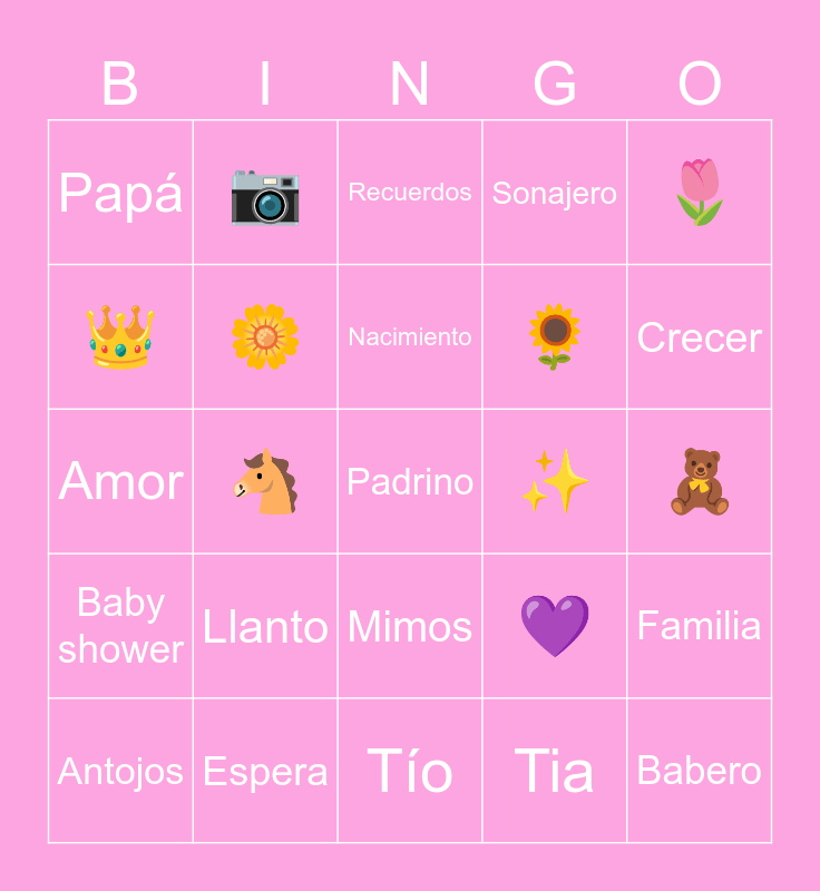 This bingo card has 95 words: ๐, Catalina, Tia, ๐ฅฐ, ๐พ, Toallitas, ๐, Espera, 3, ๐, Momentos, ๐ฉโโค๏ธโ๐จ, Cariรฑo, Nacimiento, Andador, Papรก, Crecer, 5, Risas, Sonrisa, Mamadera, Primeros pasos, Fotos, Peluche, Sonajero, ๐, Maternidad, ๐ป, ๐, Gatear, Llanto, Cochecito, Juegos, Parto, Antojos, โญ, Tรญo, Chupete, Amor, ๐ก, Familia, ๐ด, Mimos, ๐ท, ๐, โจ, 4, ๐ป, 2, Embarazo, ๐ง, ๐งโ๐พ, Babero, Talco, ๐, ๐, Ternura, Abuelos, ๐ค, Mordedor, ๐ผ, Paรฑal, ๐, ๐, Bebรฉ, ๐คฑ, ๐ฆ, Alegrรญa, Recuerdos, ๐ฎ, Cuna, Juguete, Padrino, ๐คฐ, Primeras palabras, ๐, Emociรณn, Sueรฑo, Ecografรญa, ๐ท, ๐ถ, ๐ฆ, ๐ผ, Criar, ๐งธ, Baby shower, ๐, Paรฑalera, Mama, ๐, ๐ธ, Abrazo, Casa, Ropa and Madrina.