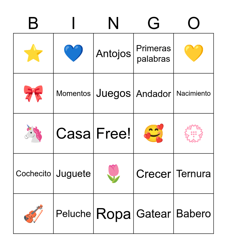 This bingo card has a free space and 91 words: Mimos, Pañal, 🌷, Ecografía, Tia, 🧁, 💕, 👩❤️👨, Llanto, Espera, 🌈, Sueño, Cariño, 💮, 🌼, Juegos, Toallitas, 🌸, Maternidad, Bebé, Sonajero, Cuna, Ropa, Tío, 🦄, Peluche, Primeros pasos, 💜, Risas, Padrino, 🐕, Ternura, Parto, Cochecito, ⭐, Primeras palabras, Antojos, 🤱, Casa, Nacimiento, 🎻, 🎀, 💚, 🦋, 👑, Crecer, 💋, Familia, 🤰, 🚜, Abuelos, Andador, 🐞, Mordedor, Pañalera, Alegría, 🥰, 👶, Papá, 🧑🌾, Baby shower, 🐴, 🌻, Chupete, 🍔, Mamadera, 📷, Gatear, Criar, 🐾, Juguete, Babero, Emoción, Embarazo, 💙, Momentos, 🤍, Talco, Mama, Abrazo, ✨, 💛, Sonrisa, Catalina, Madrina, 🍼, Recuerdos, 🧸, 🏡, Amor and Fotos.