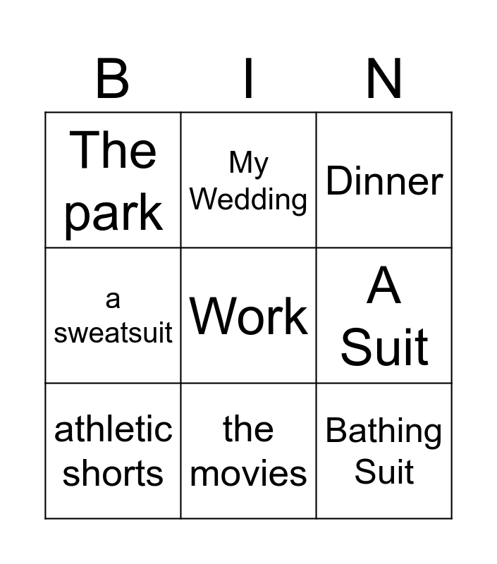 This bingo card has 12 words: Beach, Bathing Suit, Work, A Suit, My Wedding, Dinner, the movies, Sports Game, The park, a sweatsuit, athletic shorts and a T-Shirt.