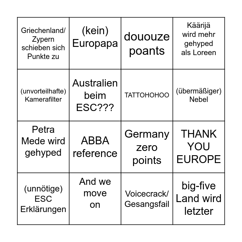 This bingo card has 16 words: And we move on, THANK YOU EUROPE, dououze poants, Griechenland/ Zypern schieben sich Punkte zu, Petra Mede wird gehyped, (kein) Europapa, Germany zero points, Voicecrack/ Gesangsfail, (unvorteilhafte) Kamerafilter, Australien beim ESC???, (unnötige) ESC Erklärungen, Käärijä wird mehr gehyped als Loreen, ABBA reference, (übermäßiger) Nebel, TATTOHOHOO and big-five Land wird letzter.