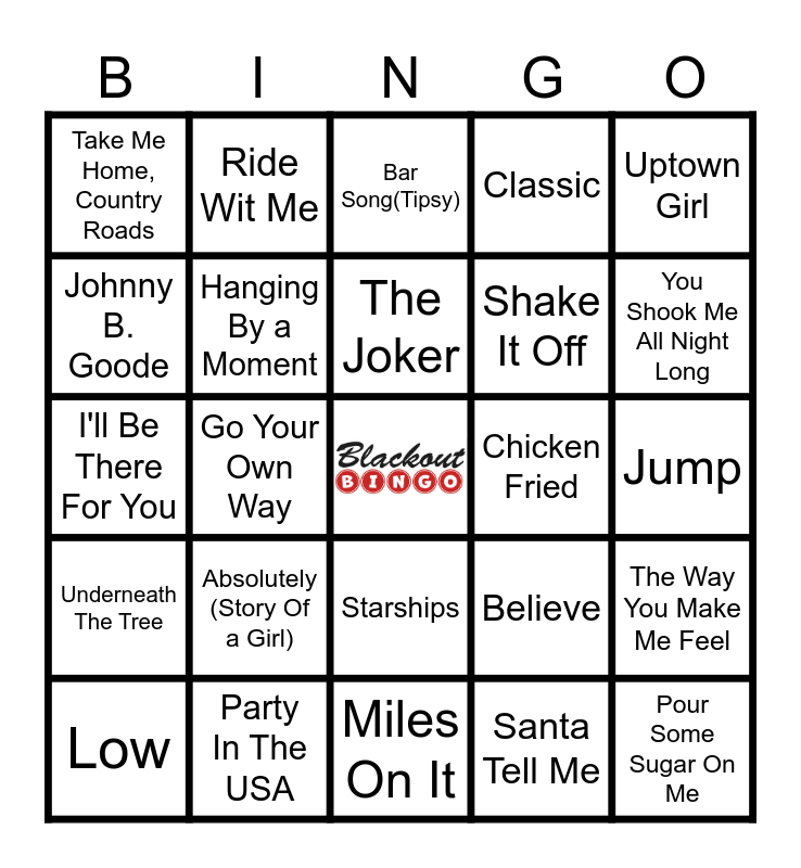 This bingo card has a free space and 79 words: Don't Stop Me Now, Tiny Dancer, Bar Song(Tipsy), Simple Man, Sweet Child Of Mine, I Got A Feeling, Hold On, Mr. Brightside, Respect, Merry Christmas, Happy Holidays, F**king Perfect, Brass Monkey, Classic, Take Me Home, Country Roads, You Make It Feel Like Christmas, Johnny B. Goode, Fast Car, Absolutely (Story Of a Girl), Girls Just Want To Have Fun, Jump, Whats Up?, Uptown Girl, I'll Be There For You, The Joker, Hanging By a Moment, September, Wake Me Up Before You Go-Go, Friday I'm In Love, Sweet Caroline, Basket Case, You Shook Me All Night Long, I Want It That Away, Miles On It, Brown Eyed Girl, Low, Chicken Fried, Girls, Girls, Girls, Lil Boo Thang, Centuries, Pour Some Sugar On Me, Back In Black, Cold Heart, Life Is A Highway, Heaven, Accidentally In Love, Ride Wit Me, Like A Prayer, Dancing In The Moonlight, How You Remind Me, My Girl, The Way You Make Me Feel, Go Your Own Way, Believe, Stacey's Mom, Hot Girl Bummer, Hollaback Girl, Come and Get Your Love, Can't Stop The Feeling, Trumpets, Starships, Shake It Off, Firework, Sorry, Smells Like Teen Spirit, Mistletoe, Shape Of You, Hit Me With Your Best Shot, Jumper, Mountain Music, Underneath The Tree, Party In The USA, Hard Fought Hallelujah, I'm The Problem, Changes, Drunk(And I Don't Wanna Go Home), Santa Tell Me, Don't Stop Believing, All I Want For Christmas Is You and Last Christmas.