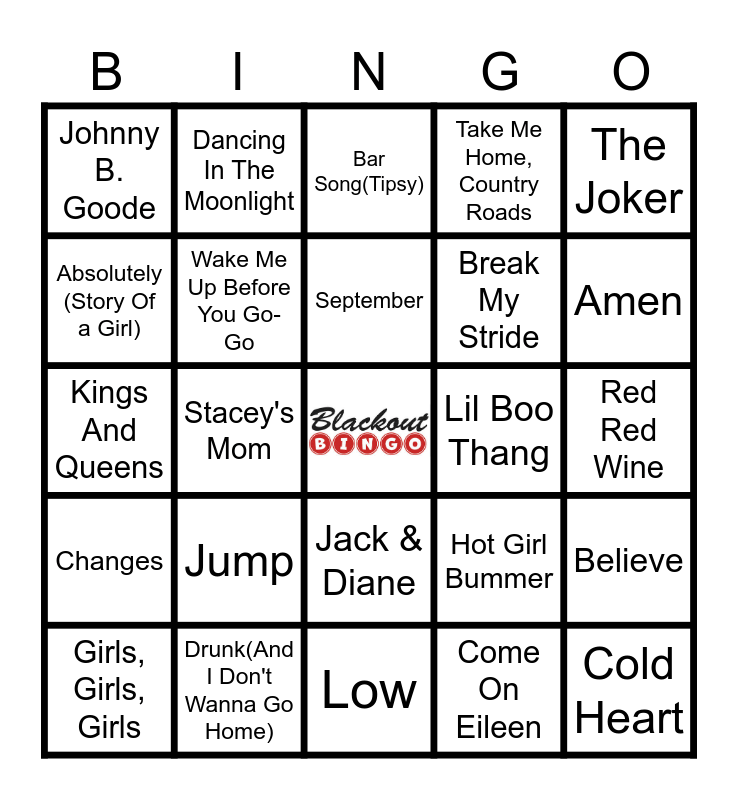 This bingo card has a free space and 79 words: Don't Stop Me Now, Tiny Dancer, Bar Song(Tipsy), Simple Man, Sweet Child Of Mine, I Got A Feeling, Hold On, Mr. Brightside, Respect, F**king Perfect, Brass Monkey, Choosin' Texas, Take Me Home, Country Roads, Johnny B. Goode, Fast Car, Absolutely (Story Of a Girl), Girls Just Want To Have Fun, Jump, Whats Up?, Red Red Wine, I'll Be There For You, The Joker, Kings And Queens, September, Wake Me Up Before You Go-Go, Friday I'm In Love, Sweet Caroline, Basket Case, Another Brick In The Wall, Pt. 2, I Want It That Away, Amen, Brown Eyed Girl, Low, Chicken Fried, Girls, Girls, Girls, Lil Boo Thang, Lose Yourself, Pour Some Sugar On Me, Thunderstruck, Cold Heart, I Think We're Alone Now, Summer Of '69, In The Air Tonight, Ride Wit Me, Like A Prayer, Dancing In The Moonlight, How You Remind Me, My Girl, The Way You Make Me Feel, Go Your Own Way, Believe, Stacey's Mom, Hot Girl Bummer, Hollaback Girl, Come and Get Your Love, Can't Stop The Feeling, Trumpets, Starships, Shake It Off, Jack & Diane, Break My Stride, Smells Like Teen Spirit, Shape Of You, Hit Me With Your Best Shot, Jumper, Mountain Music, Party In The USA, Jessie's Girl, I'm The Problem, Changes, Drunk(And I Don't Wanna Go Home), Don't Stop Believing, The Gambler, Sweet Home Alabama, Smile, Come On Eileen, Nothings Gonna Stop Us Now, Heart Of The Moment and 9 To 5.