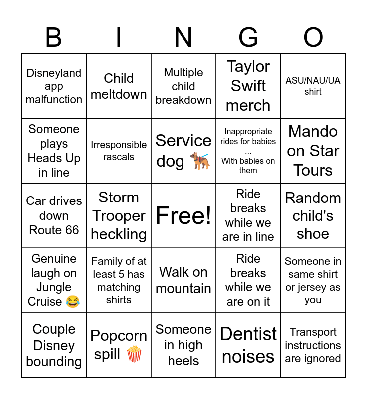 This bingo card has a free space and 24 words: Family of at least 5 has matching shirts, Popcorn spill 🍿, Service dog 🐕🦺, Couple Disney bounding, ASU/NAU/UA shirt, Disneyland app malfunction, Someone plays Heads Up in line, Child meltdown, Ride breaks while we are in line, Walk on mountain, Inappropriate rides for babies ... With babies on them, Car drives down Route 66, Ride breaks while we are on it, Someone in same shirt or jersey as you, Irresponsible rascals, Dentist noises, Random child's shoe, Multiple child breakdown, Mando on Star Tours, Storm Trooper heckling, Transport instructions are ignored, Genuine laugh on Jungle Cruise 😂, Taylor Swift merch and Someone in high heels.