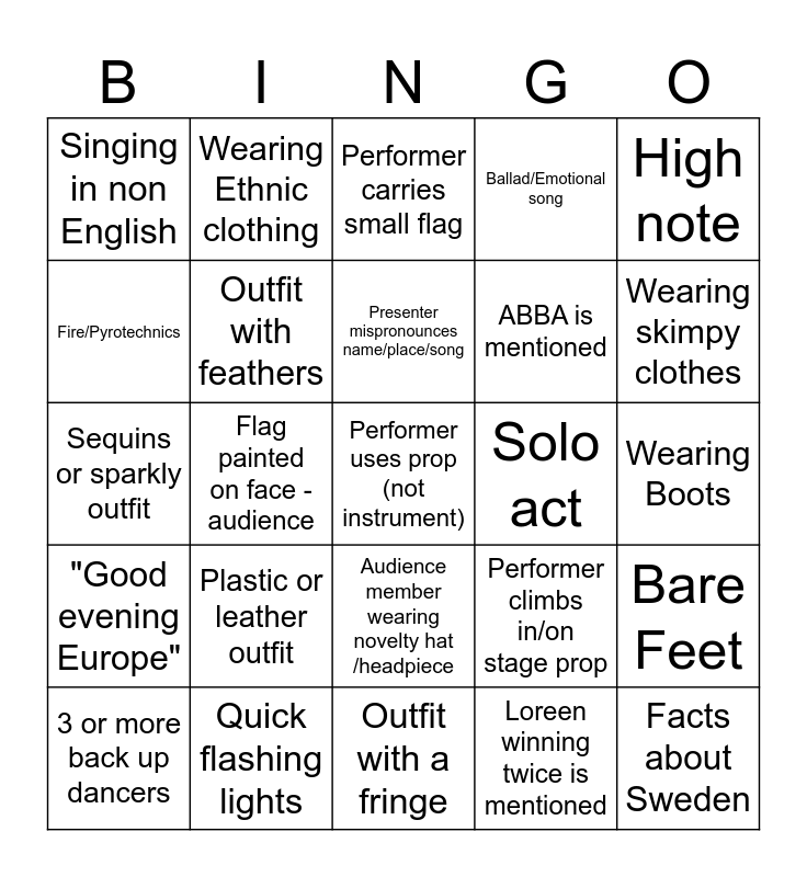 This bingo card has 35 words: Rainbow flag, Heart shaped hand gesture, Stage lights turn red for performance, Outfit with feathers, Audience member wearing novelty hat /headpiece, Ballad/Emotional song, Fire/Pyrotechnics, Costume change on stage, Presenter mispronounces name/place/song, Confetti, Sequins or sparkly outfit, High note, Performer playing own instrument, Fake rain or wind, Singing in non English, Solo act, Loreen winning twice is mentioned, Flag painted on face - audience, "Good evening Europe", Performer uses prop (not instrument), Performer climbs in/on stage prop, 3 or more back up dancers, Bare Feet, Quick flashing lights, Performer carries small flag, Wearing skimpy clothes, Facts about Sweden, Smoke Machine, ABBA is mentioned, Wearing Boots, Wearing High Heels, Outfit with a fringe, Plastic or leather outfit, Wearing Ethnic clothing and Wearing sunglasses on stage.