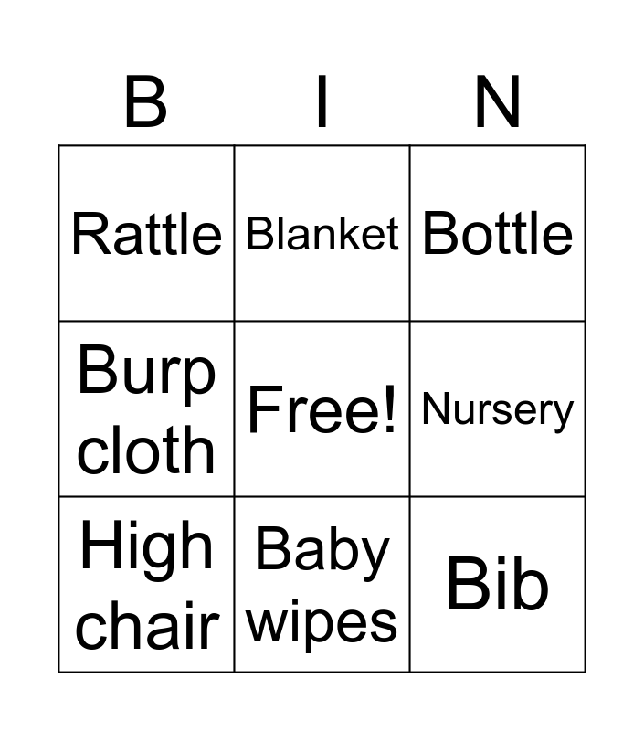 This bingo card has a free space and 20 words: Diaper, Pacifier, Bottle, Onesie, Crib, Bib, Stroller, Rattle, Baby monitor, Blanket, Teething, Mobile, Nursery, Feeding, High chair, Changing table, Baby wipes, Burp cloth, Sleep sack and Baby carrier.