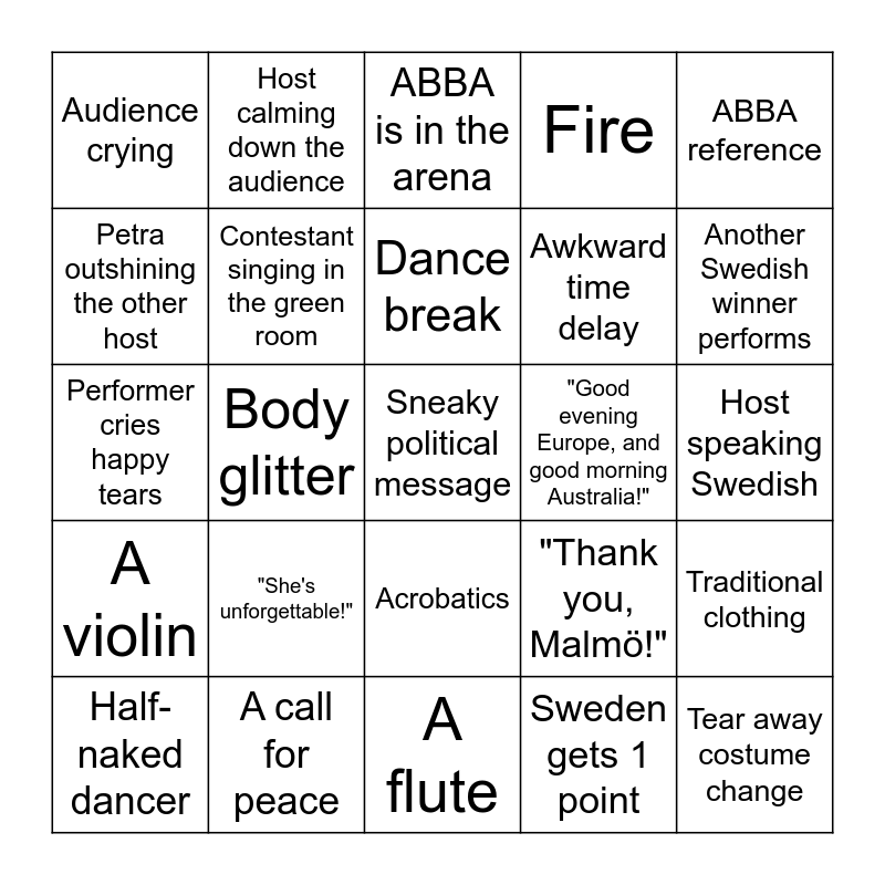 This bingo card has 25 words: "She's unforgettable!", A flute, Dance break, Half-naked dancer, ABBA reference, Audience crying, Petra outshining the other host, Host calming down the audience, "Good evening Europe, and good morning Australia!", Acrobatics, Awkward time delay, Performer cries happy tears, "Thank you, Malmö!", Traditional clothing, Contestant singing in the green room, Tear away costume change, Host speaking Swedish, ABBA is in the arena, Another Swedish winner performs, Body glitter, Sneaky political message, A call for peace, A violin, Fire and Sweden gets 1 point.