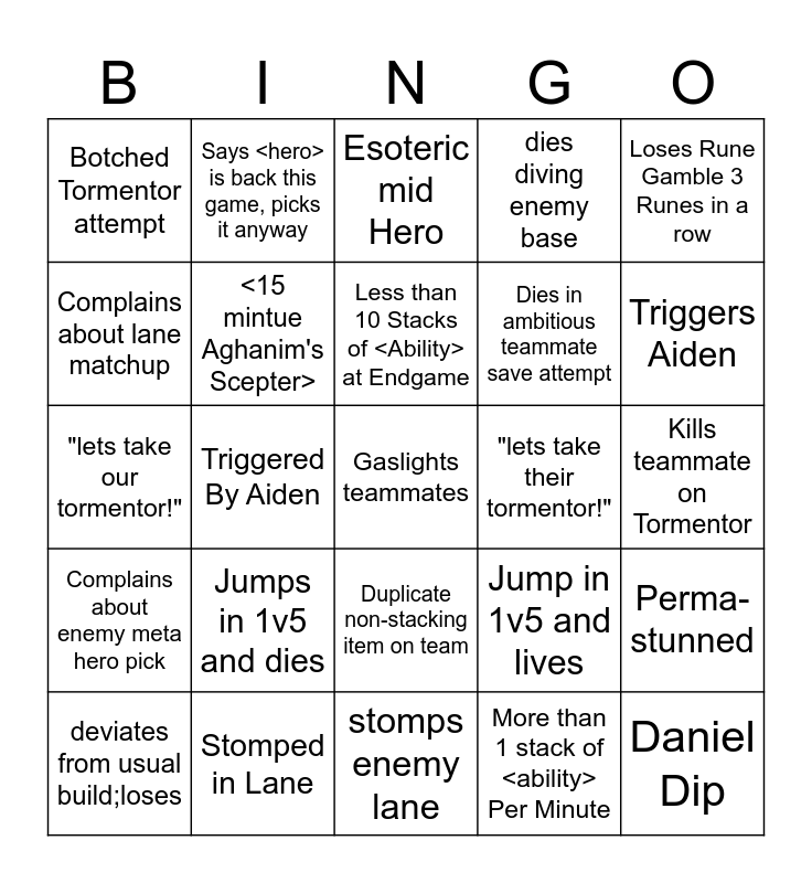 This bingo card has a free space and 24 words: Jumps in 1v5 and dies, Stomped in Lane, Less than 10 Stacks of <Ability> at Endgame, deviates from usual build;loses, Loses Rune Gamble 3 Runes in a row, Botched Tormentor attempt, Complains about lane matchup, Says <hero> is back this game, picks it anyway, "lets take their tormentor!", Duplicate non-stacking item on team, Dies in ambitious teammate save attempt, "lets take our tormentor!", Jump in 1v5 and lives, Perma-stunned, <15 mintue Aghanim's Scepter>, More than 1 stack of <ability> Per Minute, Kills teammate on Tormentor, Esoteric mid Hero, Triggers Aiden, Triggered By Aiden, Daniel Dip, Complains about enemy meta hero pick, dies diving enemy base and stomps enemy lane.
