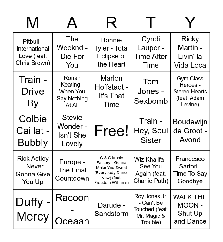 This bingo card has a free space and 69 words: Danny Vera - Roller Coaster, Boudewijn de Groot - Avond, DI-RECT - Soldier On, Dire Straits - Money For Nothing, Racoon - Oceaan, Eminem - Lose Yourself, Cyndi Lauper - Time After Time, CKay - love nwantiti (ah ah ah), Ricky Martin - Livin' la Vida Loca, 2 Unlimited - No Limit, Francesco Sartori - Time To Say Goodbye, will.i.am - Big And Chunky, Pitbull - International Love (feat. Chris Brown), Bonnie Tyler - Total Eclipse of the Heart, Shania Twain - Man! I Feel Like A Woman!, Stevie Wonder - Isn't She Lovely, C & C Music Factory - Gonna Make You Sweat (Everybody Dance Now) (feat. Freedom Williams), Tom Jones - Sexbomb, Aqua - Barbie Girl, Rick Astley - Never Gonna Give You Up, Train - Hey, Soul Sister, Wiz Khalifa - See You Again (feat. Charlie Puth), Gym Class Heroes - Stereo Hearts (feat. Adam Levine), Matt Simons - Catch & Release - Deepend Remix, Madcon - Don't Worry (with Ray Dalton) - Radio Edit, Adam Lambert - Ghost Town, Mando Diao - Dance with Somebody, Robbie Williams - Candy, Roy Jones Jr. - Can't Be Touched (feat. Mr. Magic & Trouble), Mykola Dmytrovych Leontovych - Carol of the Bells, The Weeknd - Die For You, X Ambassadors - Renegades, Ricchi E Poveri - Sarà perché ti amo, Ben E. King - Stand By Me, Stromae - Formidable, Céline Dion - My Heart Will Go On - Love Theme from "Titanic", Chubby Checker - Let's Twist Again, Bee Gees - Tragedy, Train - Drive By, Culture Club - Karma Chameleon - Remastered 2002, Europe - The Final Countdown, WALK THE MOON - Shut Up and Dance, MIKA - Relax, Take It Easy, H8trid - Get Knocked Down, Alexandra Stan - Mr. Saxobeat - Radio Edit, Duffy - Mercy, Birdy - People Help the People, INNA - Deja Vu, Black Eyed Peas - Where Is The Love?, Ronan Keating - When You Say Nothing At All, Marlon Hoffstadt - It's That Time, John West - Lekkerding, Black Eyed Peas - My Humps, Darude - Sandstorm, Tino Martin - Hartslag Van De Stad, GIMS - Est-ce que tu m'aimes ? - Pilule bleue, Nelly Furtado - All Good Things (Come To An End), Teddy Swims - The Door, Gordon - Kon Ik Maar Even Bij Je Zijn, Colbie Caillat - Bubbly, Rihanna - Don't Stop The Music, Edward Maya - Stereo Love, James Arthur - Impossible, James Brown & The Famous Flames - I Got You (I Feel Good), MEAU - Stukje Van Mij, Guus Meeuwis - Geef Mij Je Angst, Marco Borsato - Rood - Single Version, Bobby Shmurda - Hot N*gga and Joost - Europapa.