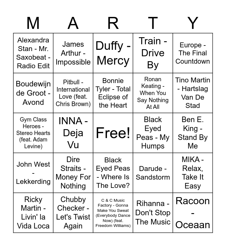 This bingo card has a free space and 69 words: Ricchi E Poveri - Sarà perché ti amo, Ben E. King - Stand By Me, Stromae - Formidable, Céline Dion - My Heart Will Go On - Love Theme from "Titanic", Chubby Checker - Let's Twist Again, Bee Gees - Tragedy, Train - Drive By, Culture Club - Karma Chameleon - Remastered 2002, Europe - The Final Countdown, WALK THE MOON - Shut Up and Dance, MIKA - Relax, Take It Easy, H8trid - Get Knocked Down, Alexandra Stan - Mr. Saxobeat - Radio Edit, Duffy - Mercy, Birdy - People Help the People, INNA - Deja Vu, Black Eyed Peas - Where Is The Love?, Ronan Keating - When You Say Nothing At All, Marlon Hoffstadt - It's That Time, John West - Lekkerding, Black Eyed Peas - My Humps, Darude - Sandstorm, Tino Martin - Hartslag Van De Stad, GIMS - Est-ce que tu m'aimes ? - Pilule bleue, Nelly Furtado - All Good Things (Come To An End), Teddy Swims - The Door, Gordon - Kon Ik Maar Even Bij Je Zijn, Colbie Caillat - Bubbly, Rihanna - Don't Stop The Music, Edward Maya - Stereo Love, James Arthur - Impossible, James Brown & The Famous Flames - I Got You (I Feel Good), MEAU - Stukje Van Mij, Guus Meeuwis - Geef Mij Je Angst, Marco Borsato - Rood - Single Version, Bobby Shmurda - Hot N*gga, Joost - Europapa, Danny Vera - Roller Coaster, Boudewijn de Groot - Avond, DI-RECT - Soldier On, Dire Straits - Money For Nothing, Racoon - Oceaan, Eminem - Lose Yourself, Cyndi Lauper - Time After Time, CKay - love nwantiti (ah ah ah), Ricky Martin - Livin' la Vida Loca, 2 Unlimited - No Limit, Francesco Sartori - Time To Say Goodbye, will.i.am - Big And Chunky, Pitbull - International Love (feat. Chris Brown), Bonnie Tyler - Total Eclipse of the Heart, Shania Twain - Man! I Feel Like A Woman!, Stevie Wonder - Isn't She Lovely, C & C Music Factory - Gonna Make You Sweat (Everybody Dance Now) (feat. Freedom Williams), Tom Jones - Sexbomb, Aqua - Barbie Girl, Rick Astley - Never Gonna Give You Up, Train - Hey, Soul Sister, Wiz Khalifa - See You Again (feat. Charlie Puth), Gym Class Heroes - Stereo Hearts (feat. Adam Levine), Matt Simons - Catch & Release - Deepend Remix, Madcon - Don't Worry (with Ray Dalton) - Radio Edit, Adam Lambert - Ghost Town, Mando Diao - Dance with Somebody, Robbie Williams - Candy, Roy Jones Jr. - Can't Be Touched (feat. Mr. Magic & Trouble), Mykola Dmytrovych Leontovych - Carol of the Bells, The Weeknd - Die For You and X Ambassadors - Renegades.