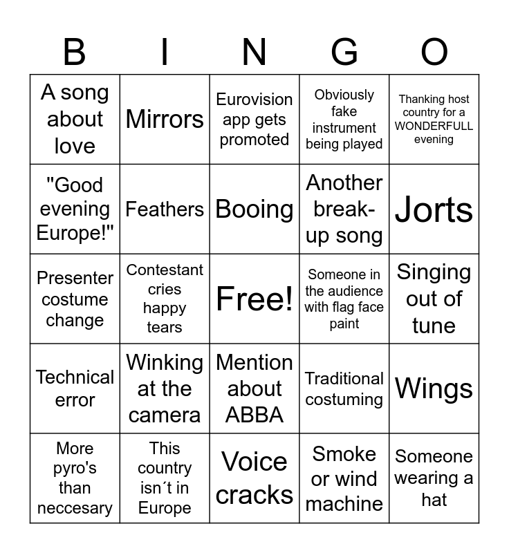This bingo card has a free space and 39 words: Fake rain, Sweden bragging about winning 7 times, Mid song costume change, Feathers, More pyro's than neccesary, Mention about ABBA, Booing, Host messes up, Thanking host country for a WONDERFULL evening, Technical error, Contestant cries happy tears, Obviously fake instrument being played, Someone wearing a hat, Singing out of tune, Someone in the audience with flag face paint, Winking at the camera, Loreen performs, A song about love, Rap segment in song, Traditional costuming, ''Good evening Europe!'', Voice cracks, Another break-up song, Jorts, Acrobatics, Contestant cries happy tears, Host speaking French, Body glitter, Long high note, Mirrors, 360 camera spin, Someone speaking Swedish, Eurovision app gets promoted, This country isn´t in Europe, Smoke or wind machine, Rainbow flag, Wings, Presenter costume change and Sequins.