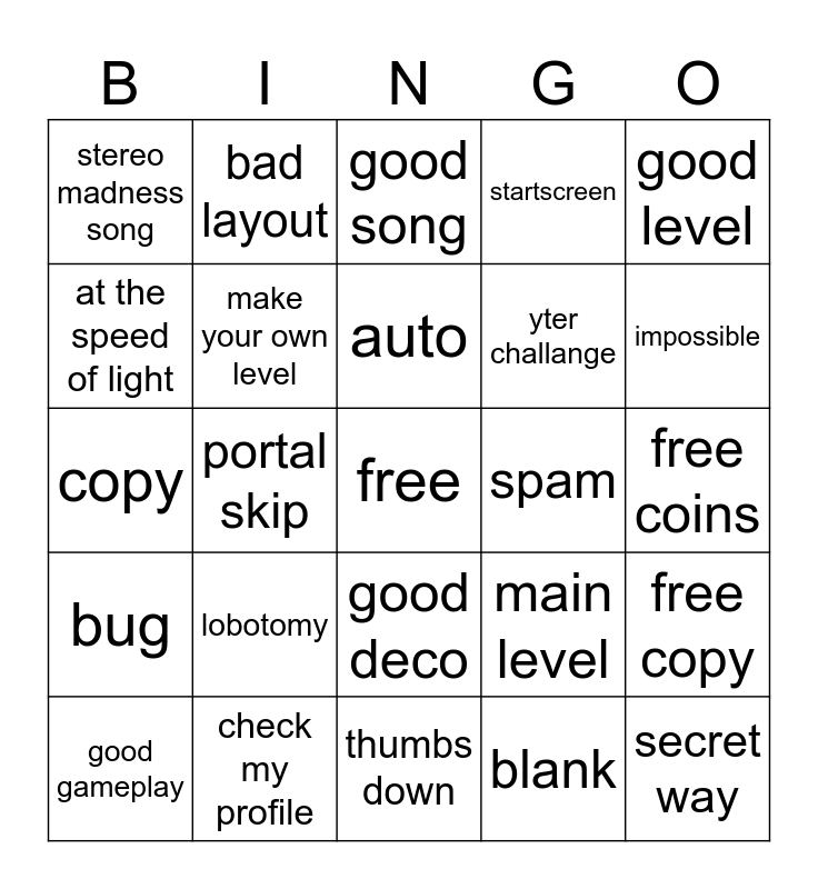 This bingo card has a free space and 24 words: lobotomy, check my profile, auto, good gameplay, good level, stereo madness song, at the speed of light, bad layout, spam, good deco, yter challange, copy, main level, free copy, make your own level, blank, free coins, good song, impossible, portal skip, secret way, bug, startscreen and thumbs down.