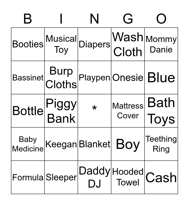This bingo card has a free space and 24 words: Keegan, Sleeper, Playpen, Formula, Mommy Danie, Booties, Bassinet, Musical Toy, Mattress Cover, Blanket, Onesie, Bottle, Boy, Teething Ring, Burp Cloths, Hooded Towel, Bath Toys, Diapers, Blue, Piggy Bank, Cash, Baby Medicine, Wash Cloth and Daddy DJ.