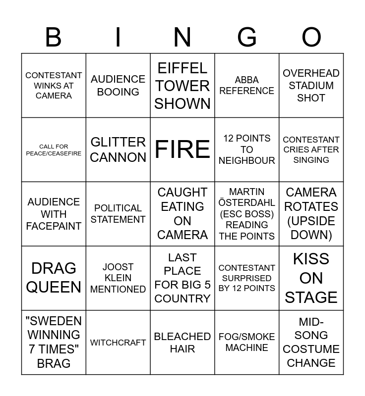This bingo card has 36 words: Free!, ANY TYPE OF ANIMAL IS SHOWN, FACE SHOWN ON LED SCREEN, GLITTER CANNON, CONTESTANT SURPRISED BY 12 POINTS, DRAG QUEEN, FIRE, "GOOD MORNING AUSTRALIA", OVERHEAD STADIUM SHOT, LGBT+ FLAG, POLITICAL STATEMENT, ABBA REFERENCE, HOST SPEAKS FRENCH, MARTIN ÖSTERDAHL (ESC BOSS) READING THE POINTS, CONTESTANT CRIES AFTER SINGING, CONTESTANT WINKS AT CAMERA, MID-SONG COSTUME CHANGE, JOOST KLEIN MENTIONED, CAUGHT EATING ON CAMERA, EIFFEL TOWER SHOWN, CAMERA ROTATES (UPSIDE DOWN), KISS ON STAGE, WITCHCRAFT, "SWEDEN WINNING 7 TIMES" BRAG, BLEACHED HAIR, AUDIENCE BOOING, AUDIENCE WITH FACEPAINT, HOST SINGS, 12 POINTS TO NEIGHBOUR, CALL FOR PEACE/CEASEFIRE, GERMANY GETS A POINT, GAY JOKE, FOG/SMOKE MACHINE, LAST PLACE FOR BIG 5 COUNTRY, 5+ SEC DELAY BEFORE POINT ANNOUNCEMENT and HOST + COUNTRY REP TALK AT SAME TIME.