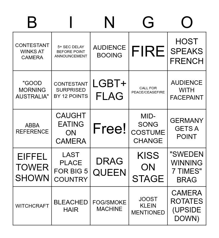 This bingo card has a free space and 35 words: ANY TYPE OF ANIMAL IS SHOWN, FACE SHOWN ON LED SCREEN, GLITTER CANNON, CONTESTANT SURPRISED BY 12 POINTS, DRAG QUEEN, FIRE, "GOOD MORNING AUSTRALIA", OVERHEAD STADIUM SHOT, LGBT+ FLAG, POLITICAL STATEMENT, ABBA REFERENCE, HOST SPEAKS FRENCH, MARTIN ÖSTERDAHL (ESC BOSS) READING THE POINTS, CONTESTANT CRIES AFTER SINGING, CONTESTANT WINKS AT CAMERA, MID-SONG COSTUME CHANGE, JOOST KLEIN MENTIONED, CAUGHT EATING ON CAMERA, EIFFEL TOWER SHOWN, CAMERA ROTATES (UPSIDE DOWN), KISS ON STAGE, WITCHCRAFT, "SWEDEN WINNING 7 TIMES" BRAG, BLEACHED HAIR, AUDIENCE BOOING, AUDIENCE WITH FACEPAINT, HOST SINGS, 12 POINTS TO NEIGHBOUR, CALL FOR PEACE/CEASEFIRE, GERMANY GETS A POINT, GAY JOKE, FOG/SMOKE MACHINE, LAST PLACE FOR BIG 5 COUNTRY, 5+ SEC DELAY BEFORE POINT ANNOUNCEMENT and HOST + COUNTRY REP TALK AT SAME TIME.