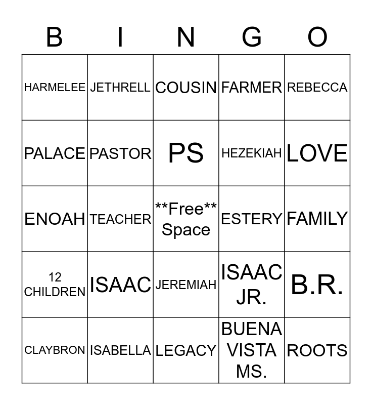 This bingo card has a free space and 24 words: ISAAC, ISABELLA, PS, CLAYBRON, REBECCA, HARMELEE, PALACE, JETHRELL, ESTERY, JEREMIAH, HEZEKIAH, ENOAH, ISAAC JR., B.R., PASTOR, BUENA VISTA MS., FAMILY, COUSIN, LOVE, TEACHER, ROOTS, 12 CHILDREN, FARMER and LEGACY.