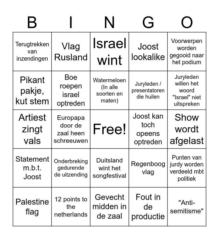 This bingo card has a free space and 29 words: Palestine flag, NL vlag, Europapa door de zaal heen schreeuwen, Terugtrekken van jury leden, Terugtrekken van inzendingen, Israel wint, Boe roepen israel optreden, Onderbreking gedurende de uitzending, Joost kan toch opeens optreden, 12 points to the netherlands, Show wordt afgelast, "Anti-semitisme", Gevecht midden in de zaal, Fout in de productie, Juryleden willen het woord "Israel" niet uitspreken, Politieke statements van Artiest, Duitsland wint het songfestival, Statement m.b.t. Joost, Voorwerpen worden gegooid naar het podium, Artiest zingt vals, Regenboog vlag, Rusland / oekraine statement, Juryleden / presentatoren die huilen, Pikant pakje, kut stem, Joost lookalike, Vlag Rusland, Punten van jurdy worden verdeeld mbt politiek, Watermeloen (In alle soorten en maten) and Blauwe vogel wordt gespot.