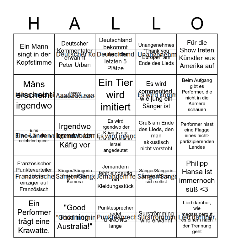 This bingo card has 17 images and 25 words: Sänger/Sängerin flirtet mit der Kamera, Punktesprecher redet UNNÖTIG lange, Ein Tier wird imitiert, Ein Performer trägt eine Krawatte., Für die Show treten Künstler aus Amerika auf, Ein Mann singt in der Kopfstimme, Måns erscheint irgendwo, Deutscher Kommentator erwähnt Peter Urban, Gruß am Ende des Lieds, den man akkustisch nicht versteht, Jemandem fehlt eindeutig ein Kleidungsstück, Es wird kommentiert, wie jung ein Sänger ist, Eine Ländervorstellung celebriert queer, Sänger/Sängerin ist berührt von sich selbst, Philipp Hansa ist immernoch süß <3, Aaaaaaa aaaaAAAAAaAAaAAAA, Lied darüber, wie megasupergut es einem nach der Trennung geht, Performer hisst eine Flagge eines nicht-partizipierenden Landes, Deutschland bekommt einen der letzten 5 Plätze, Beim Aufgang gibt es Performer, die nicht in die Kamera schauen, Irgendwo kommt ein Käfig vor, Es wird irgendwo der Krieg in der Ukraine oder in Israel angedeutet, "Good morning Australia!", Französischer Punkteverteiler redet als einziger auf Französisch, Unangenehmes "Thank you Europe!" am Ende des Lieds and Surströmming wird erwähnt.