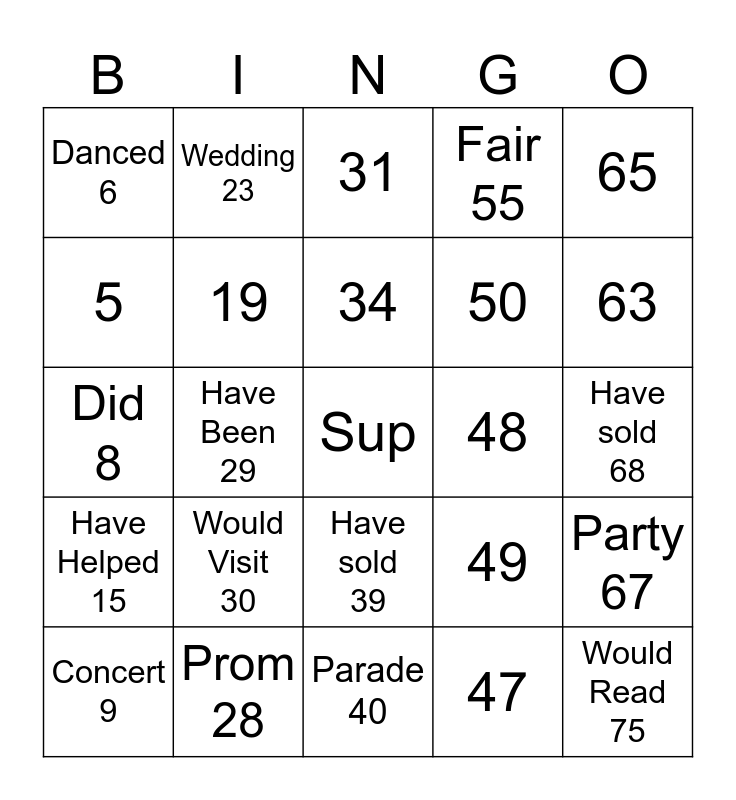This bingo card has a free space and 75 words: 1, 16, 31, 46, 61, 2, 17, 32, 47, 62, 3, 18, 48, 63, 4, 19, 33, 49, 64, 5, 20, 34, 50, 65, Danced 6, Would Buy 21, Have Done 35, Carnival 51, Went 66, Would Call 7, Have Gone 22, Festival 36, Have Taken 52, Party 67, Did 8, Wedding 23, Would Sing 37, Sold 53, Have sold 68, Concert 9, Swan 24, Graduation 38, Have sung 54, Birthday 69, Would Speak 10, Gathering 25, Have sold 39, Fair 55, Took 70, Arrive 11, Have Written 26, Parade 40, Conference 56, Have Seen 71, Reunion 12, Broke 27, Would Watch 41, Saw 57, Would Travel 72, Would Sleep 13, Prom 28, Ceremony 42, Would Work 58, Would Eat 73, Spoke 14, Have Been 29, Would Live 43, Gala 59, Ran 74, Have Helped 15, Would Visit 30, Have eaten 44, Have Swun 60, Would Read 75 and Gave 45.