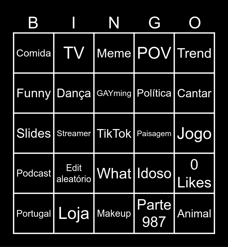 This bingo card has a free space and 24 words: Edit aleatório, Loja, GAYming, Portugal, Trend, Comida, Funny, TV, Paisagem, What, Política, Slides, Idoso, 0 Likes, Dança, Parte 987, Jogo, Meme, Cantar, Streamer, Animal, Podcast, POV and Makeup.